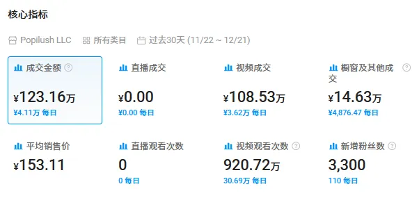 以品牌主营 TikTok 账号 @popilush 为例,该账号目前粉丝数为 14.69 万,数量不算多,但近 30 天成交金额却达到了 123.16 万元,平均下来每天就有 4.11 万元的进账金额,视频观看次数更是达到了 920.72 万次,从流量到转化都十分不错。