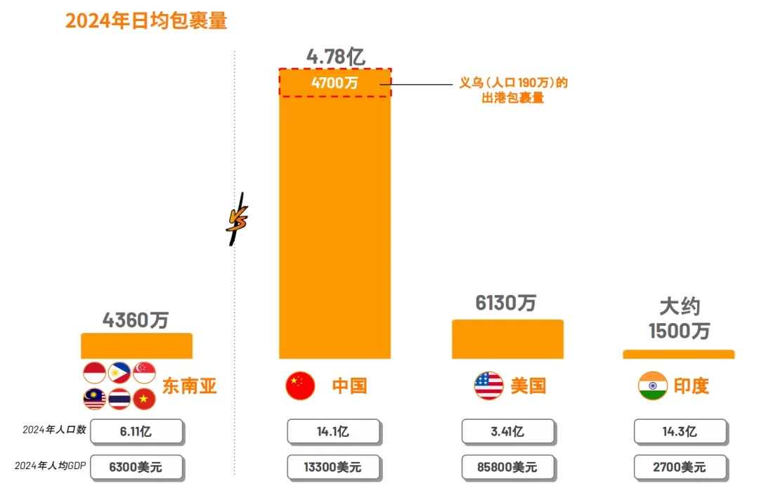 在墨腾创投今年发布的报告中,出现了一个关键词——包裹量。这次聚焦的背后,是2024 年东南亚快递行业包裹量的大幅跃升:据报告披露的数据,该区域2024年日均包裹量已达4360万件,年度增幅高达25%,远超同期电商GMV 12%的增速。尽管这个数据与中国仍有显著差距(仅义乌便拥有4700万日均包裹量),但已与美国市场水平逐步拉近。
