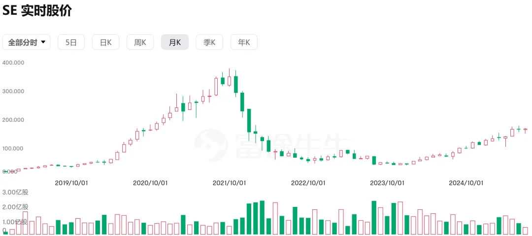 2022年,SEA因前期扩张成本陷入亏损泥潭,股价从高点一度跌至25美元左右的谷底。之后,以Shopee为核心的业务线开始通过物流效率提升、履约成本优化等实现了盈利能力的实质性改善,进入2024年,SEA已连续实现盈利,其股价从约50美元一路攀升至约140美元(截至2025年3月7日),累计涨幅超150%。