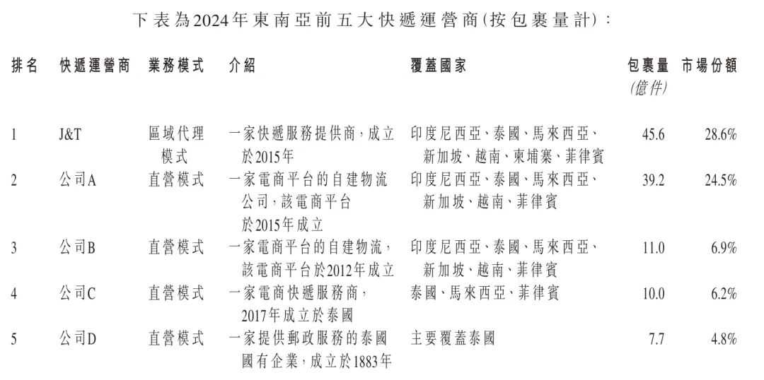 极兔速递在其年报中印证了如今物流企业的生存境况,该年报中按包裹量从高到低披露了东南亚快递物流市场的前五大公司。尽管排名中并未直接点名,但结合行业公开信息不难推断分别是:极兔速递、Shopee旗下的SPX Express、Lazada Express、泰国Flash Express及泰国邮政。