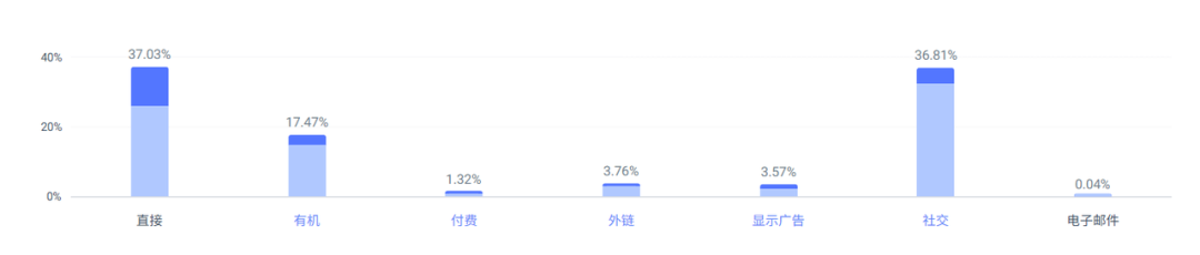 其中,直接流量占 37.03%,社交流量占 36.81%,共同构成品牌核心线上销售渠道。