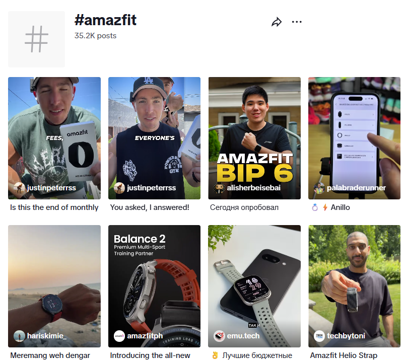 TikTok 上,账号主要围绕拆箱视频、评测视频、使用视频等内容,展示产品的独特功能和实际应用场景,并与时尚、健身类各个领域 KOL 合作,创建#amazfit 话题下引发更多素人用户发布视频评测,累计视频数量达 3.52 万条。