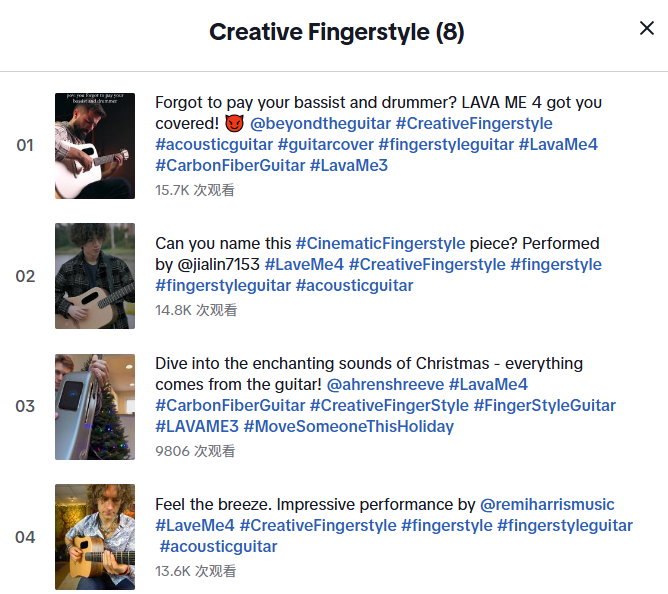 他们将内容细分为多个播放列表,围绕不同的吉他产品(如 LAVA GENIE、LAVA ME 4)和演奏风格(如 Creative Fingerstyle)进行分类,精准满足各类用户的兴趣点。