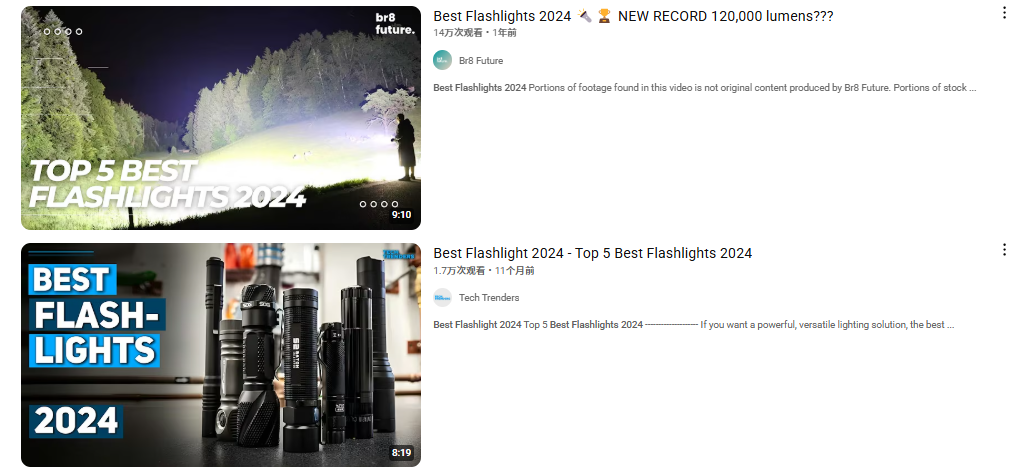 YouTube 是获取产品深度信息的重要平台。在关键词如 “best flashlight 2024”、“EDC flashlight review”、“tactical flashlight test” 下,聚集了大量性能测评类视频,涵盖亮度、续航、防水、防摔等多个维度。内容以场景化演示为主,测试过程标准严谨、逻辑清晰,有助于强化消费者对产品品质的理性判断。
