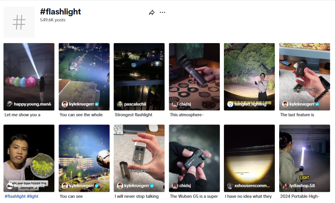 TikTok 的传播逻辑更强调情境带入与感官冲击。用户在浏览 #flashlighttest、#outdoor、#strongflashlight等标签下的短视频时,往往被“停电应急”“夜骑出行”“露营布光”等生活化场景所打动。手电筒作为应对突发状况或户外使用的“刚需”,通过博主实拍快速完成使用逻辑的传达,极易激发即时兴趣和下单冲动。