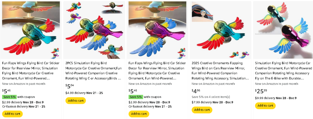 在亚马逊北美站点,从 10 月底开始陆续有伴飞小鸟产品上架,原本在国内批发价不到 10 元人民币的小鸟,被海外卖家普遍炒到至数倍以上,但从目前的销量表现来看,出单者寥寥。