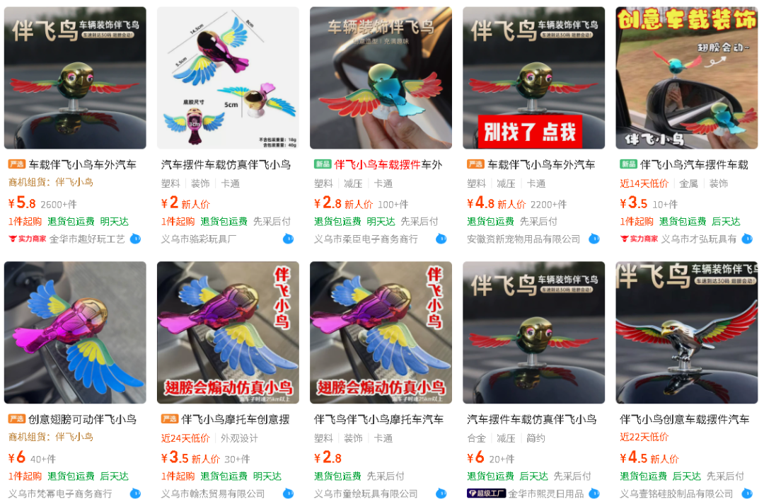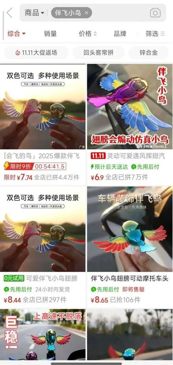 有业内人士指出,现在满网都是伴飞小鸟的视频,内容千篇一律,说明它已经从机会期进入大众认知期了,等大多数人看到的时候,再入局就稍微有点晚了。更何况,只要结构不复杂、供应链成熟,产品可以在 24 小时内被义乌商家们“抄完抄透”,而大量仿品的出现也加剧了产品价格战的出现,卷到最后,利润只会越来越薄。