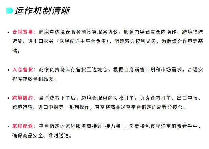 据了解,3PL边境仓运作模式为:商家先与边境仓服务商签署涵盖仓内操作、跨境运输、进出口报关(尾程配送由平台负责)的服务协议,再根据销售计划将库存备货至边境仓;消费者下单后,服务商承接仓内打单、出口申报、跨境运输、进口申报等流程,将商品送至平台指定尾程分拨仓,最终由平台尾程服务商完成配送。