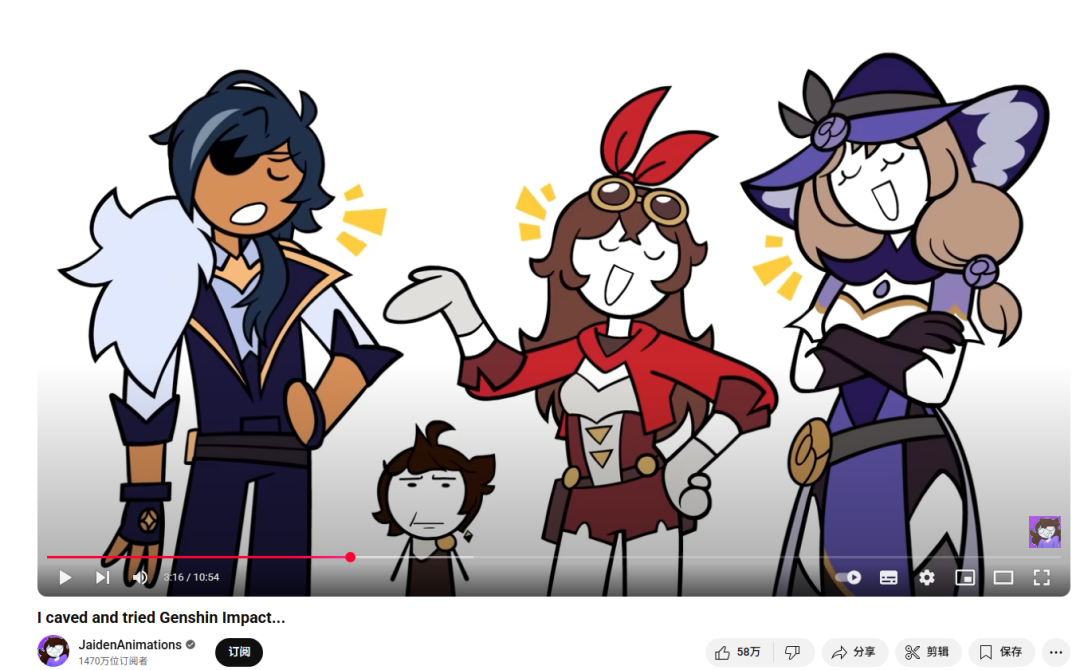 坐拥1470万YouTube订阅的动画博主@JaidenAnimations发布《I caved and tried Genshin Impact...》视频,以“从未接触过《原神》的新手”身份记录试玩全程,播放量达1010万次,超70%观众为非硬核游戏用户。