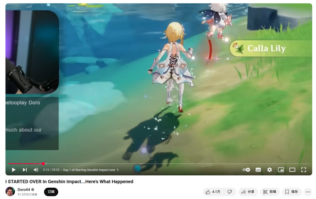 粉丝91.5万的游戏主播@Doro44发布《I STARTED OVER In Genshin Impact...Here's What Happened》视频,以“零氪重启新号”为主题,记录从创建角色到挑战副本的全过程,播放量116万次,超60%弹幕聚焦“新手攻略”“零氪攒原石技巧”。
