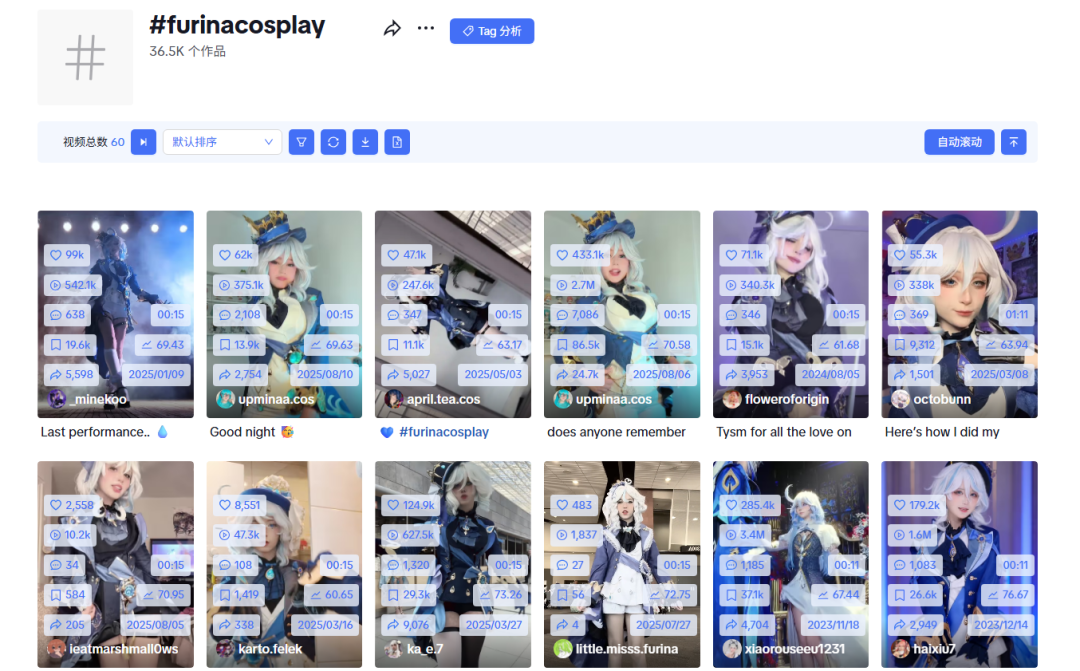 1. UGC激励:从二创到商业转化角色芙宁娜生日期间,TikTok话题#Furinacosplay下,coser博主@octobunn发布的妆容教程视频获55.3k点赞,通过冷色调眼影与细致表情管理还原角色清冷气质;美妆博主@walkingredflag98以“谁想要教程”为标题发布眼妆特写视频,精准捕捉水蓝色瞳孔与泪痣细节,收获800万次观看,评论区“求步骤”“神还原”等互动刷屏。