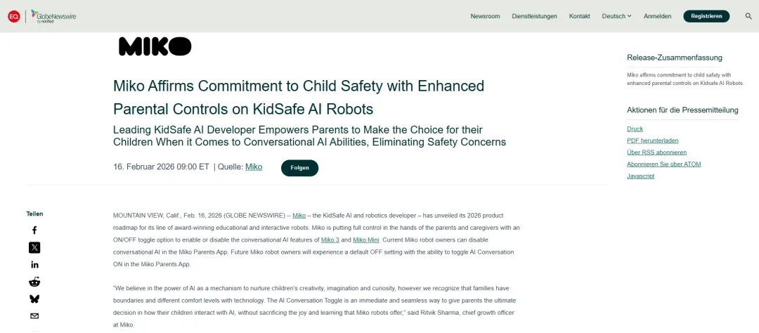 在这条赛道中,源自印度、主攻北美市场的儿童AI陪伴机器人品牌Miko,凭借核心产品Miko 3成功切入Costco等主流零售体系,还与美国大型广播集团iHeartMedia达成深度合作(iHeartMedia亦是Miko 2025年11月融资的投资方之一),其2024年估值为2.01-2.04亿美元,产品热销全球上百个国家,在北美市场的影响力持续提升。
