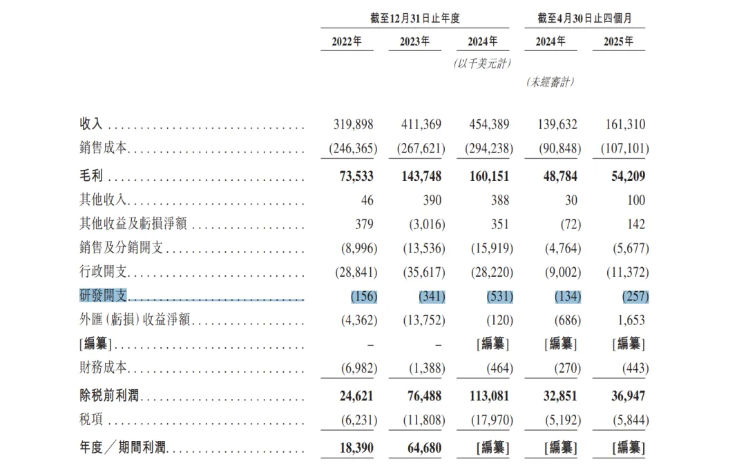 然而,高歌猛进的背后也暗藏隐忧。招股书显示,乐舒适的业绩增速已明显放缓,2024 年营收增速从前一年的 28.6% 降至 10.5% 。净利润增速从 251.7% 降至 47%。更令人警惕的是,公司在研发上的投入极其微薄。以 2024 年为例,公司 32 亿元人民币的营收,对应的研发开支不足 53.1 万美元,研发团队仅有 4 人,研发费用占营收比重低于0.12% 。