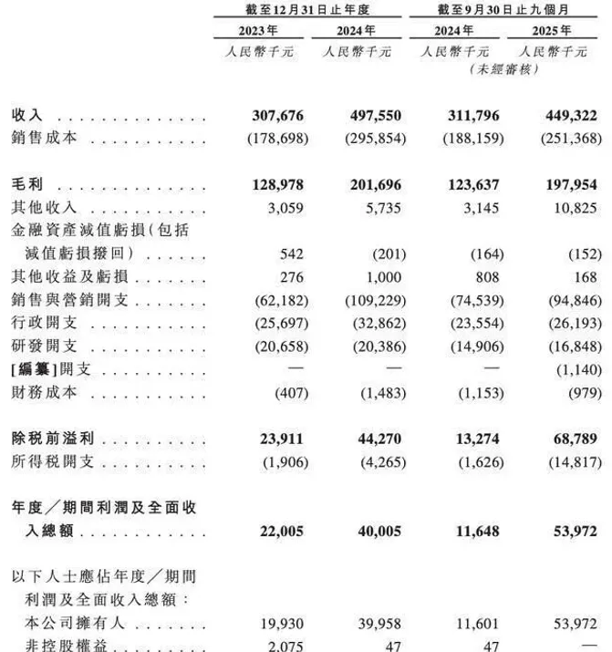 业绩表现同样亮眼,2023 年至 2024 年,公司营收从 3.08 亿元增长至 4.98 亿元,同比增幅达 61.7%;2025 年前三季度,营收已达 4.49 亿元,净利润 5397.2 万元,超过 2024 年全年水平。