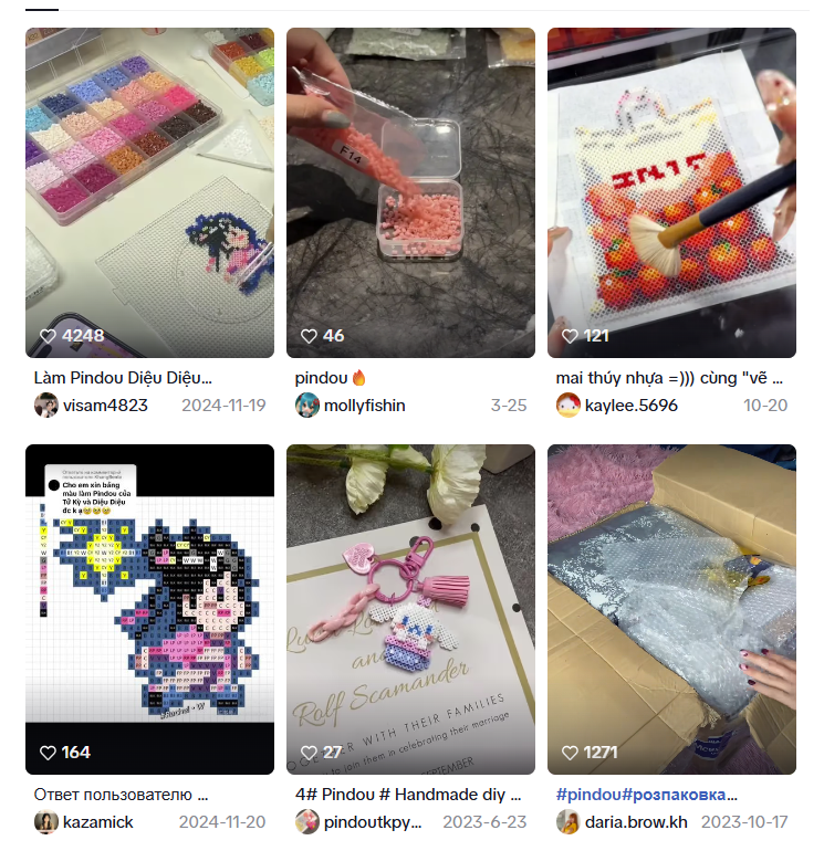 TikTok 上,不少人也加入了拼豆行列,创作者们通过短视频展示拼豆的制作过程,从用镊子将彩色豆子排列在特制塑料板上,到盖上熨烫纸用熨斗加热定型,