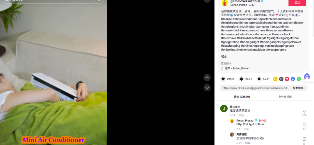 6 月 17 日,@gameloversofficial 作为一名拥有 7.4 万粉丝的家居分享博主,发布了一篇关于便携式空调的内容而爆火。