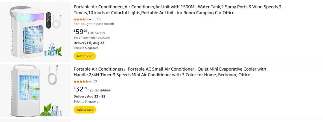 在亚马逊美国站上,便携式空调种类繁多,一般售价在 19.9 美元——69.99 美元,NPOCLK 店铺中定价 59.99 美元的迷你便携空调扇上个月卖出5000+单,总销售额超 29.95 万美元(人民币约 215.41 万)。