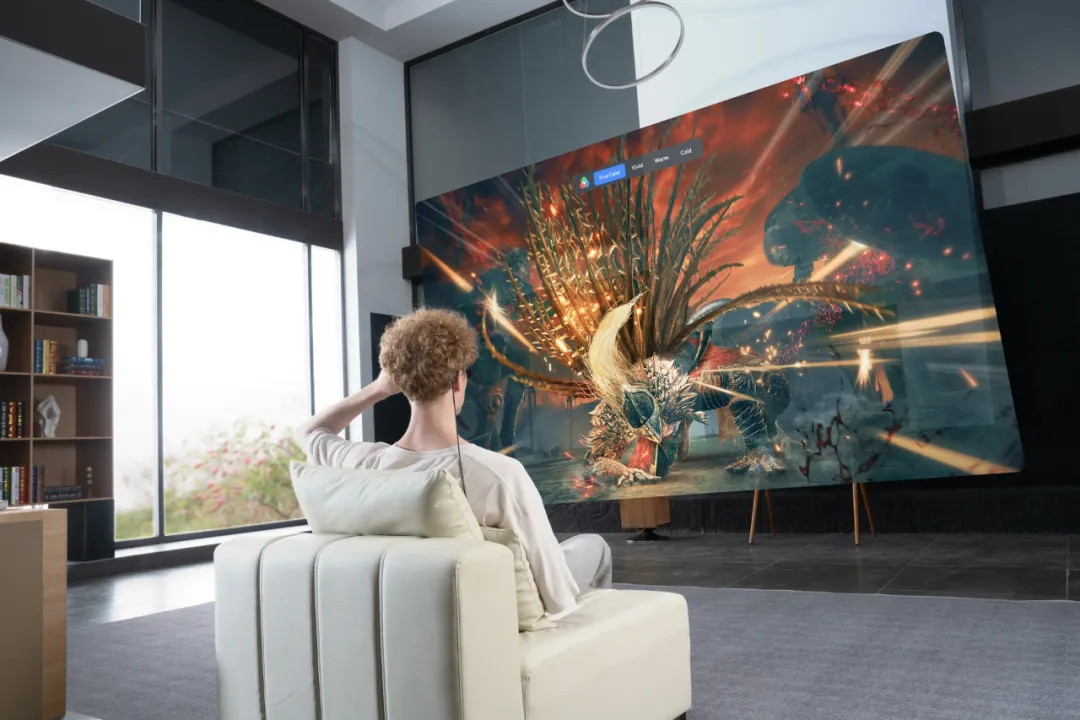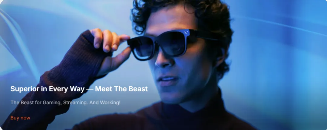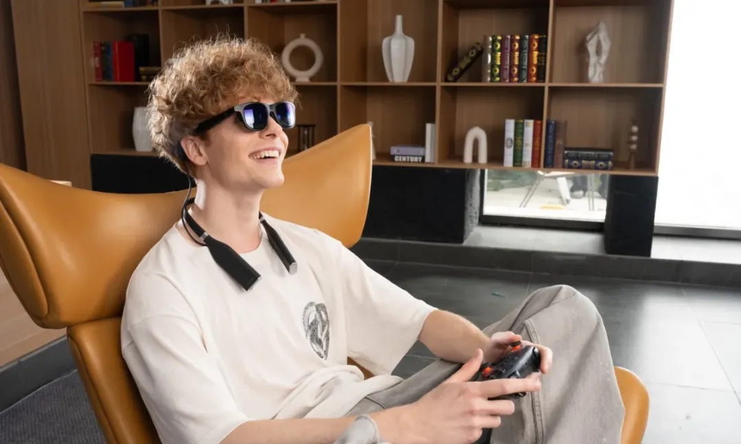 该品牌聚焦 AR 眼镜的可穿戴性、功能性和沉浸式体验,首创“颈挂计算单元+眼镜显示器”架构,成功将 AR 眼镜从投屏工具的尴尬定位中解放出来,转变为完整的沉浸式娱乐设备,支持云游戏、Switch 等多平台应用,满足用户在游戏、观影、办公等场景下的需求。