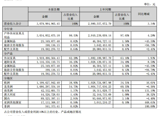 营收数据是最直观的体现。浙江永强财报数据显示,2025 年上半年营收高达 30.80 亿元,同比增长 3.34%,家具用品以高达 30.35 亿元的营收,占到了营业收入比重的 98.53%。