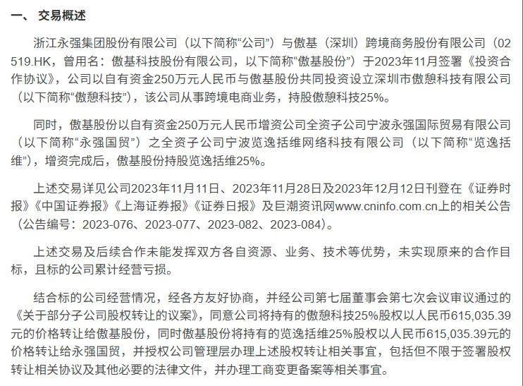 知名家居制造商浙江永强发布公告,宣布终止与傲基的跨境电商合作。双方将通过互相转让交叉持有的子公司股权完成解约。在历经两年多的交叉持股尝试后,此次合作以合资公司经营亏损近 500 万元、双方协同效果不及预期黯然落幕……