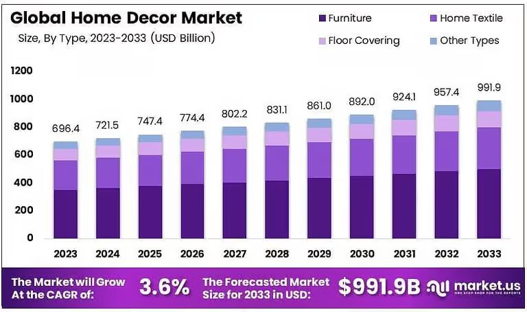到 2033 年,全球家居装饰的市场规模预计将突破 9919 亿美元,呈现出蓬勃发展的态势。