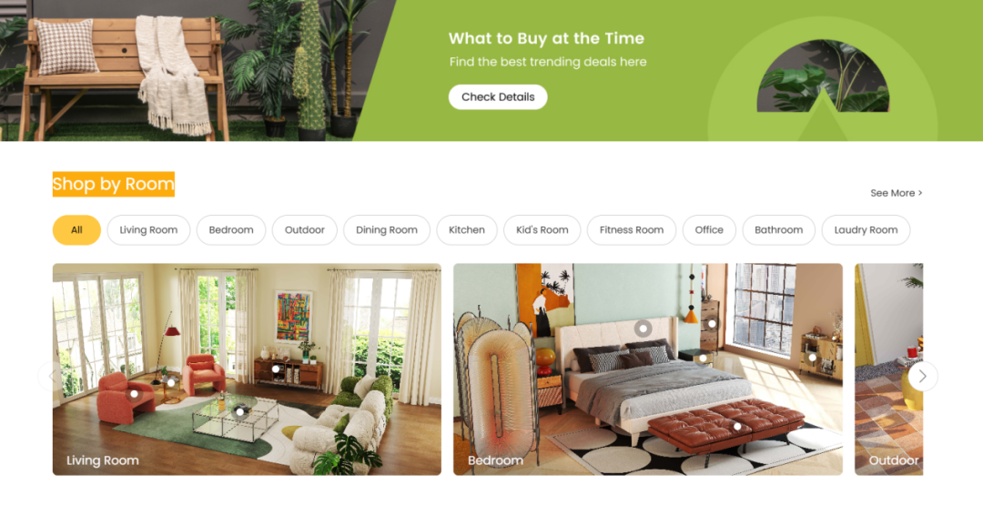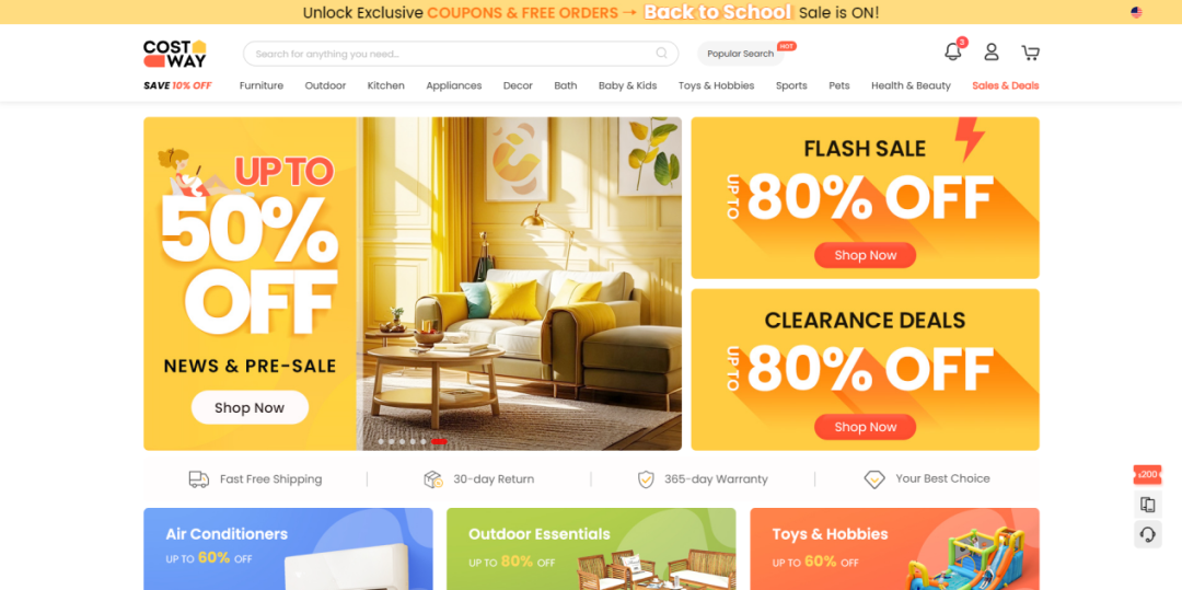 在独立站内,Costway 品牌通过高饱和度的视觉设计来吸引用户的眼球,在最醒目的首页区域标注了很多打折的标签,刺激用户购买。