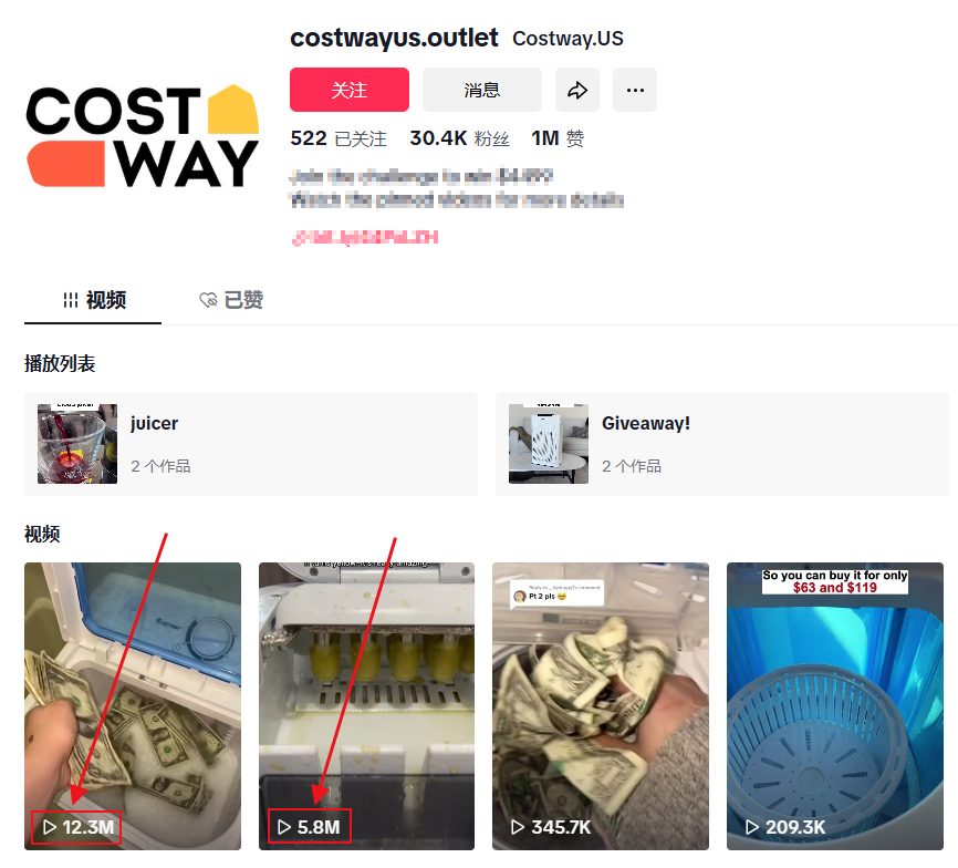 该品牌的 TikTok 子账号 @costwayus.outlet,则是 Costway 针对美区市场所建立的账号。已经累积了 3.04 万的粉丝,获赞量达到了 100 万。