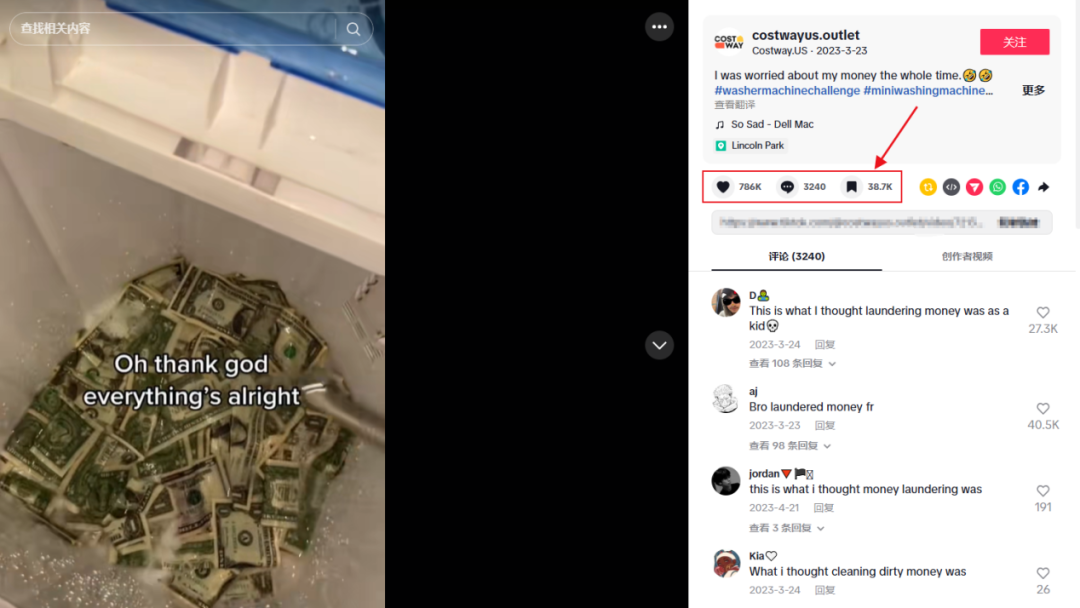 在视频中,拍摄者直接用 Costway 品牌的洗衣机来“洗”钱,如此大胆的行为引来很多人观看,都好奇下一步会发生什么。
