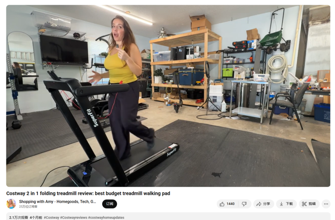 拥有 25 万订阅者的博主 Shopping with Amy 便是该品牌的合作博主,其为 Costway 品牌的二合一折叠踏步机拍摄了一条详细的测评视频,截至目前,这条视频已经收获了 2.1 万次观看。