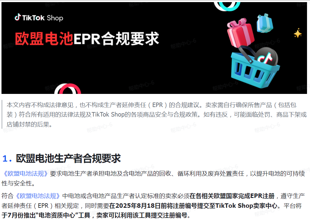 TikTok Shop 已在 7 月密集发布合规指南,向全平台卖家发出最后通牒:所有在欧盟市场销售电池或含电池商品的卖家,必须在 8 月 18 日前完成生产者责任延伸(EPR)注册并提交有效的电池 EPR 注册号。未合规卖家将面临商品强制下架甚至店铺封禁的严厉处罚。