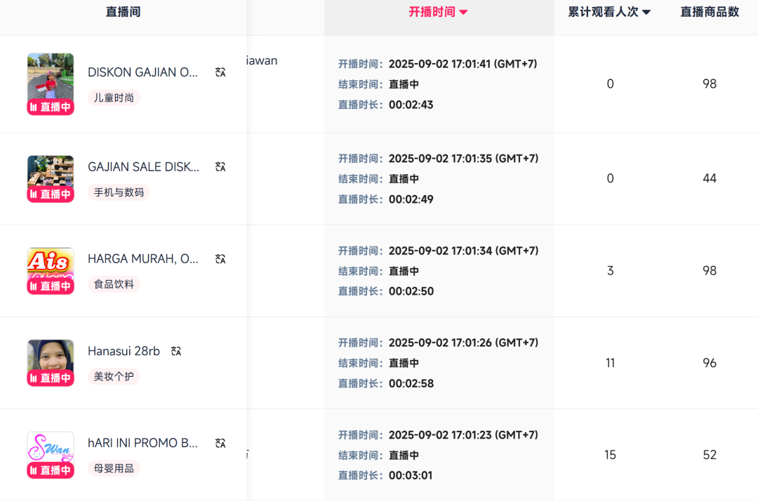 FastMoss 数据显示,9 月 2 日约 17 点,已有印尼主播开始尝试直播,但未查到 TikTok 的官方声明,不过目前刚开播的直播间已有 10 人左右的观看人数。