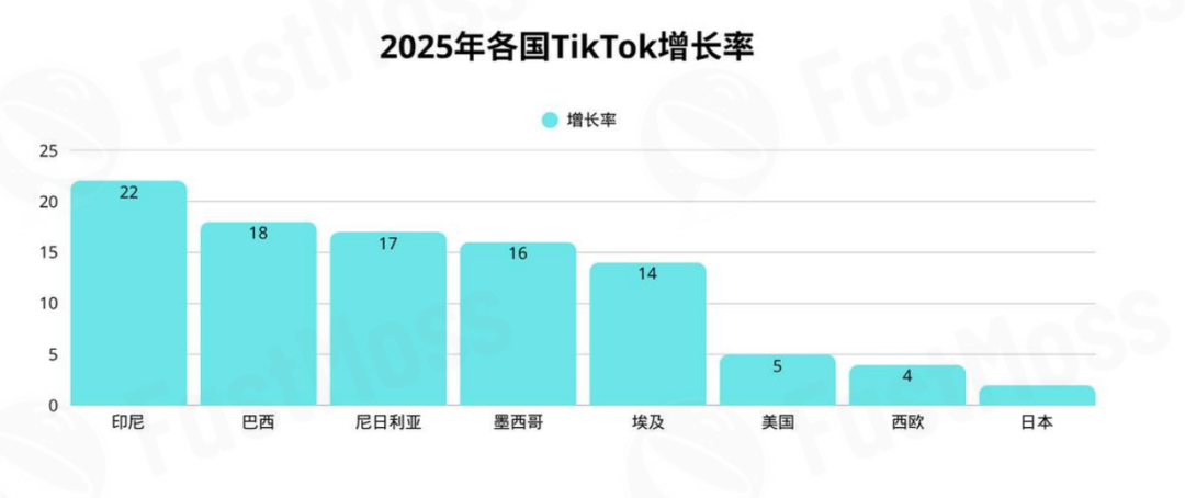 但从长期数据来看,TikTok 在印尼的核心应用地位毋庸置疑。awisee 数据显示,2025 年 TikTok 用户增长率呈现明显的地域分化趋势 ,而印尼以 22% 的用户增长率排名第一,印尼作为 TikTok 核心阵地的地位正不断巩固,高增长率背后,是印尼庞大的用户基数与深厚的市场基础 —— 无论是年轻群体的社交娱乐需求,还是中小微企业的经营需求,都与 TikTok 深度绑定。