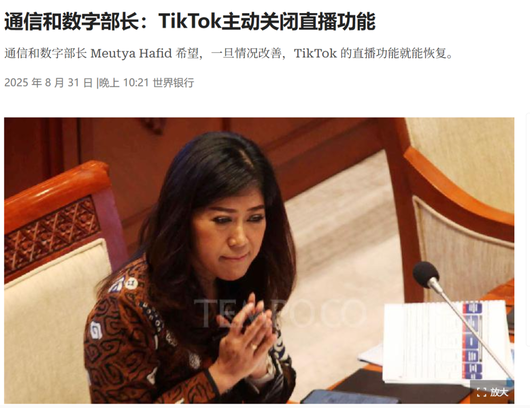 TikTok 和 Instagram 都暂时关闭了印度尼西亚的直播功能。TikTok 称此举是 “自愿采取安全措施,暂定时长几天”,同时排查违规内容;直播暂停直接冲击电商业务,卖家反馈开播按钮失效、无实时内容,销售计划受阻。