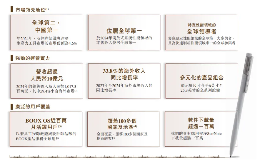 在 2023 年及 2024 年以及截至 2025 年 9 月 30 日止九个月,海外市场分别贡献总收入的 56.2%、59.4% 及 59.5%。随着海外用户对护眼阅读、低干扰办公设备需求上升,电子墨水屏产品在知识工作者、学生及专业创作者群体中逐渐打开市场空间。