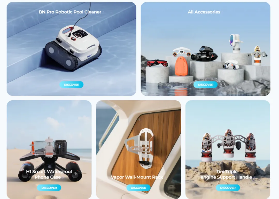 根据其独立站发布的产品来看,在个人消费者领域,除了水下助推器之外,还上线了泳池清洁机器人、水下无人机、动力浮板等产品矩阵,逐步从“极客级装备”走向更广泛的休闲水域消费场景。这些产品在设计上强调易上手、安全性与娱乐属性,既服务于潜水爱好者,也覆盖到家庭泳池、度假酒店、水上乐园等应用场景,体现出深之蓝在消费级市场上的持续拓展意图。