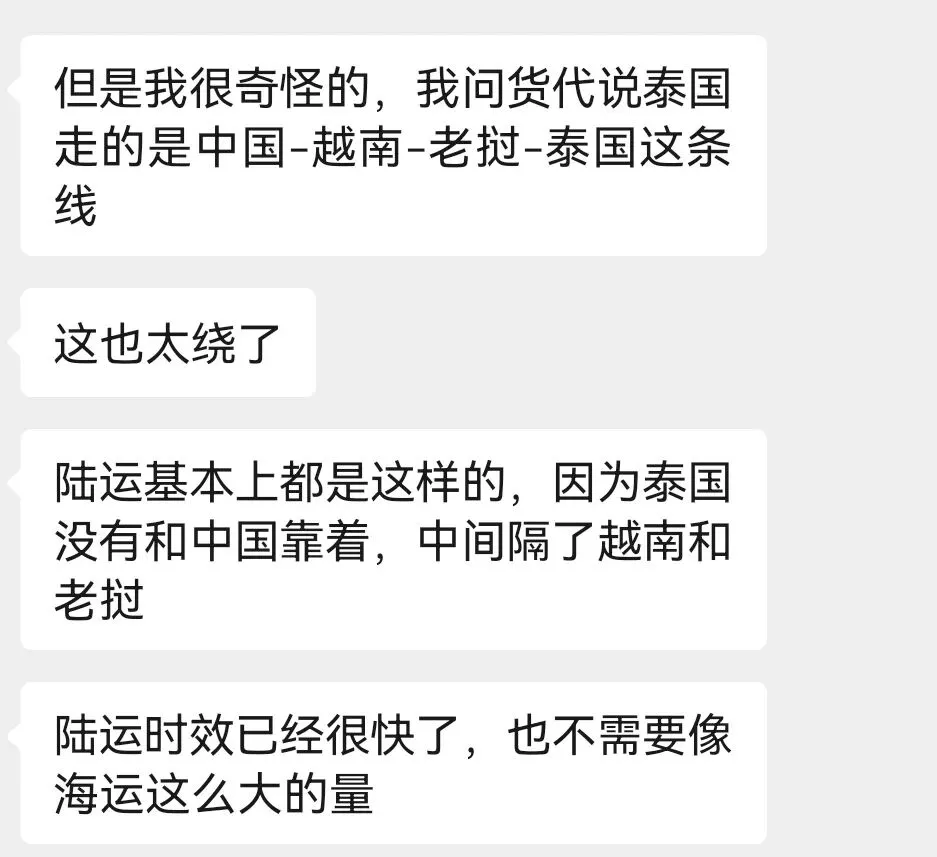 多重因素衡量下,陆运自然成为性价比最优的方案。有卖家向货代咨询后得知,运往泰国的陆运线路一般从广西出发,经越南、老挝中转再入境泰国,全程时效可控制在5~7天。