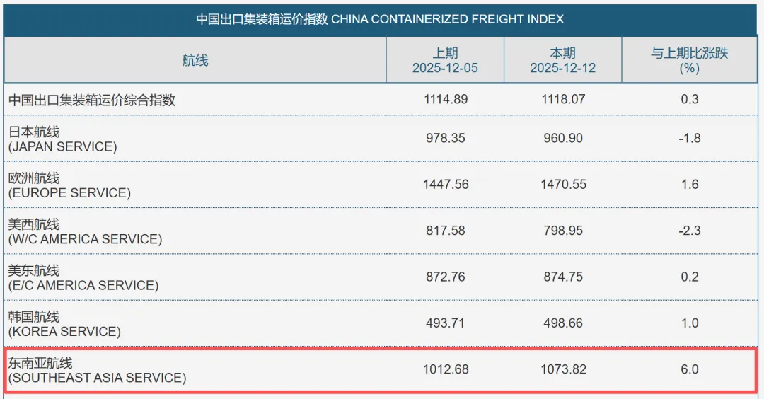 中国出口集装箱运价指数(CCFI)数据显示,12 月 12 日东南亚航线指数报 1073.82 点,较一个月前大幅上涨 23.3%;与之形成鲜明对比的是,同期美西航线运价指数仅为 798.95 点,环比下跌 5.6%,彻底打破了过去航运市场 “距离越长、运价越高” 的传统认知。