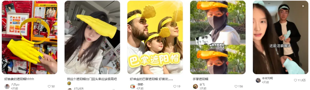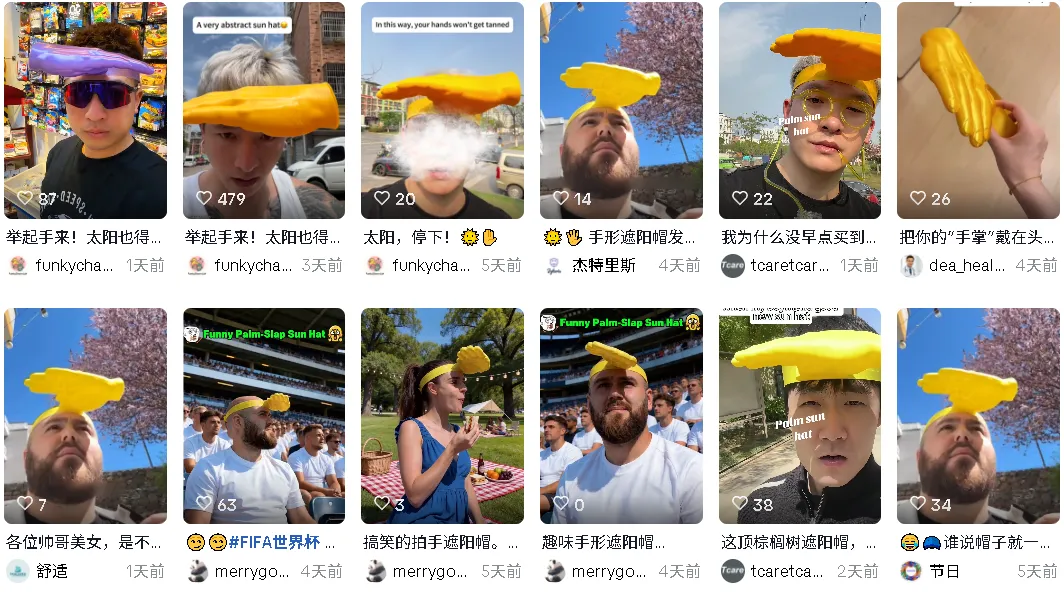 不仅国内抖音和小红书平台相关话题播放量飞涨,海外 TikTok 上同款内容也在疯狂传播,没有传统遮阳帽的笨重呆板,也不追求全面防晒,只靠一只突兀的塑料手掌,就能在音乐节、沙滩、街头赚足回头率,随手一拍就是自带话题的社交素材。