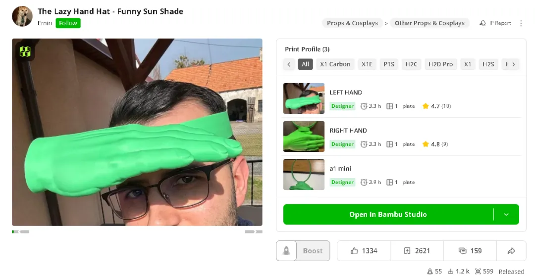 据了解,该巴掌遮阳帽的源头是今年 3 月海外创客 Emin 在 MakerWorld 平台分享了自己的 3D 打印开源模型,初衷只是一句懒人吐槽:举着手挡太阳太累,不如给自己造一只 “第三只手”。1:1 还原的成人手掌造型、可调节头箍、轻量化设计,最初只在创客圈里小范围传播,大家下载文件自己打印,在评论区互相晒作业,怎么看都只是圈内自娱自乐的小玩意。