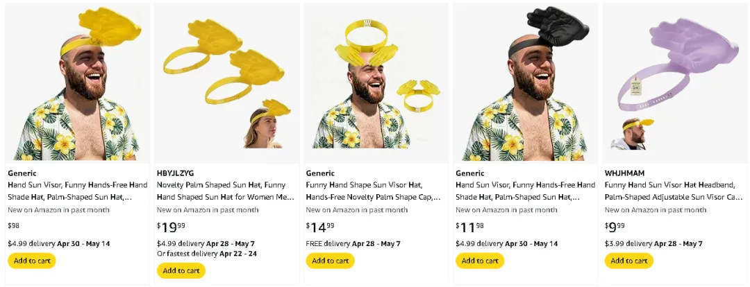直到 4 月 7 日,一条外国博主佩戴此巴掌遮阳帽的视频在 YouTube 意外发酵,荒诞的搭配与 “实用又好笑” 的反差感戳中网友笑点,也恰好契合了 Z 世代追求 “小众、搞怪、出片” 的消费心理,传播的引爆点来得猝不及防又顺理成章。