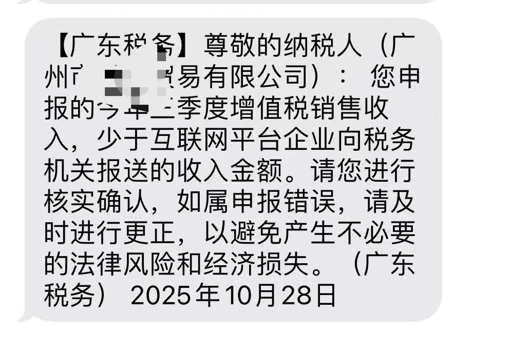 “尊敬的纳税人,您申报的第三季度增值税销售收入,少于互联网平台企业向税务机关报送的收入金额。请您进行核实确认,如属申报错误,请及时进行更正,以避免产生不必要的法律风险和经济损失。”