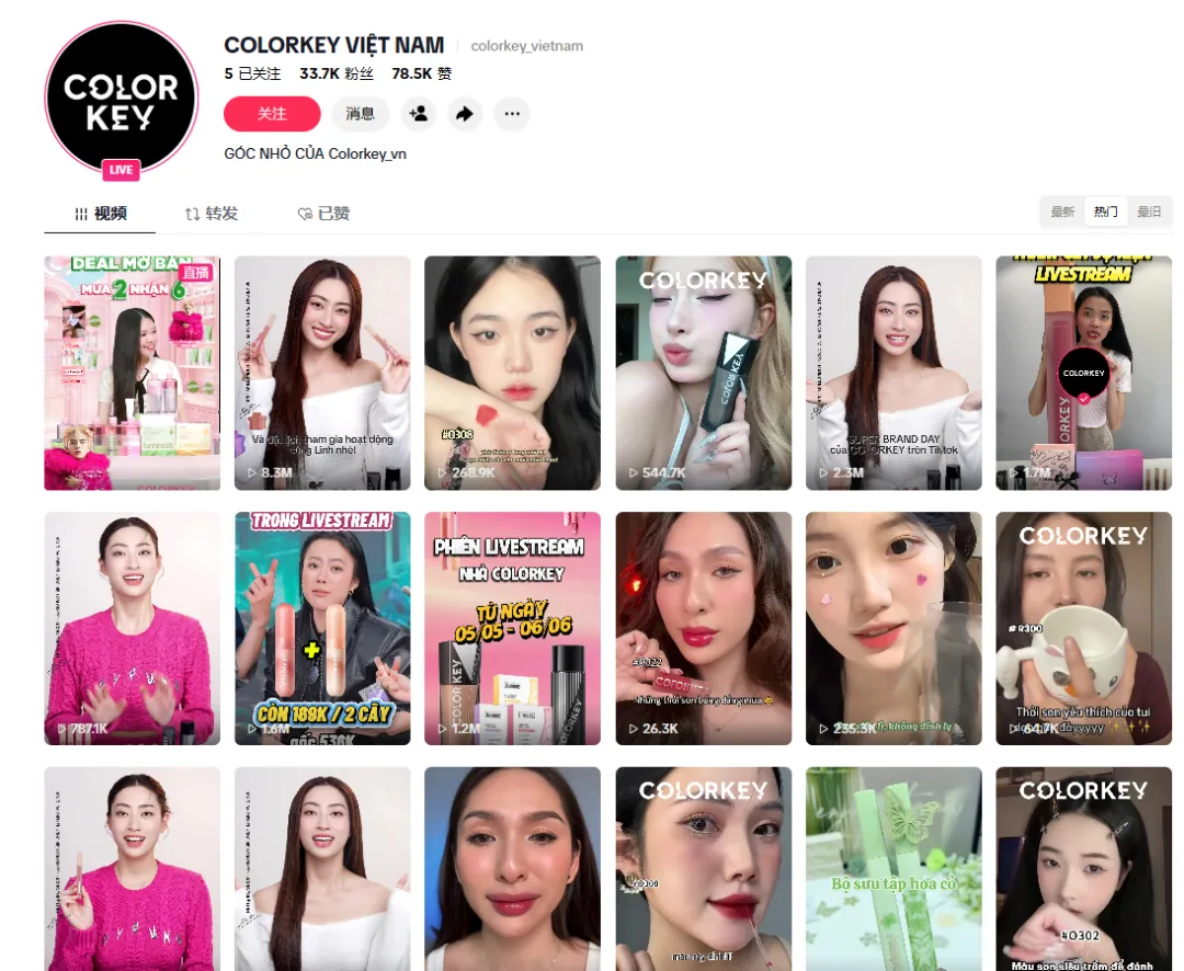 在 TikTok 平台上,colorkey 构建了越南语的内容矩阵,越南小店关联超过 8700 个达人,视频和直播内容达数千条,其标签 #colorkey 在 TikTok 上的播放量已突破 10 亿。