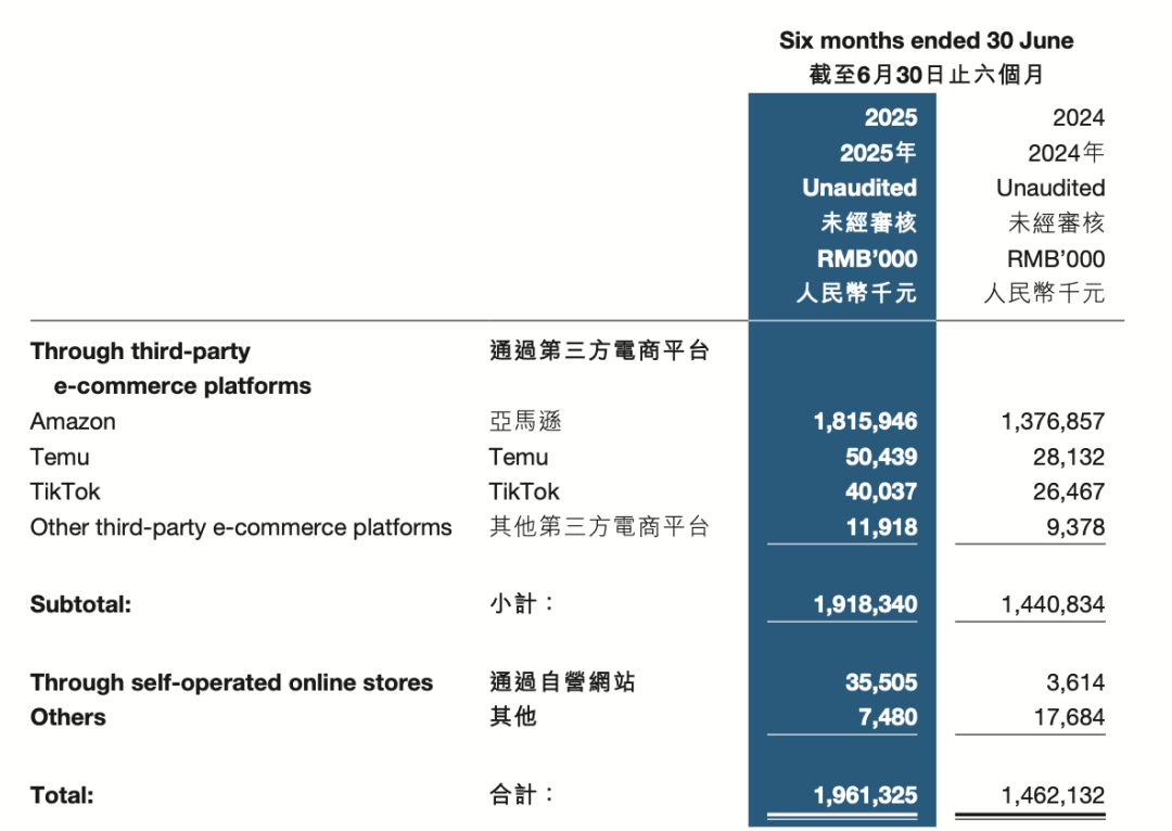 2025 年上半年,亚马逊依然是公司最重要的销售渠道,贡献了绝大部分的收入来源,且保持近 40% 的增长。
