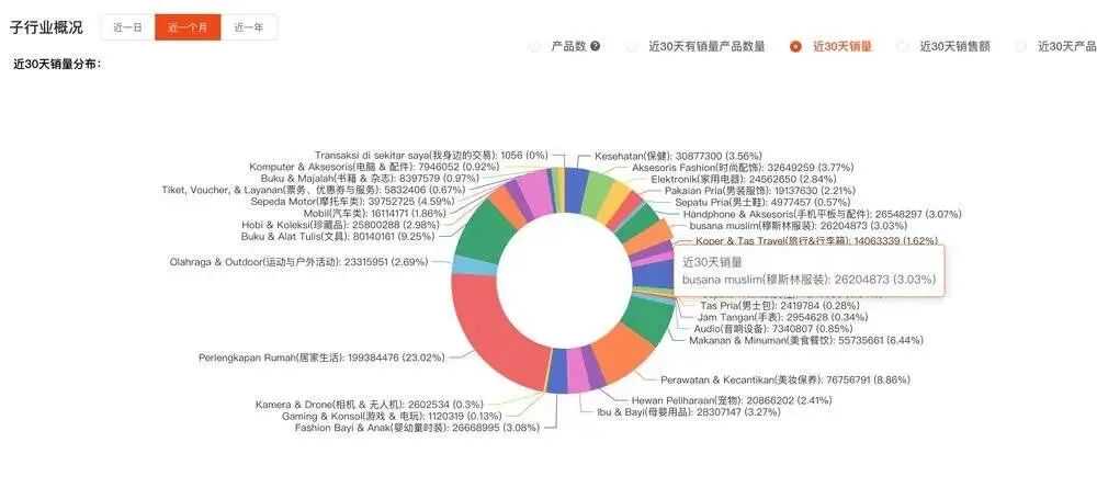 据萌啦科技提供的 TikTok 印尼站近 30 天的销量数据中:居家生活占 23%、美妆保养占 8.86%、美食餐饮 6.44%、穆斯林服饰 3%
