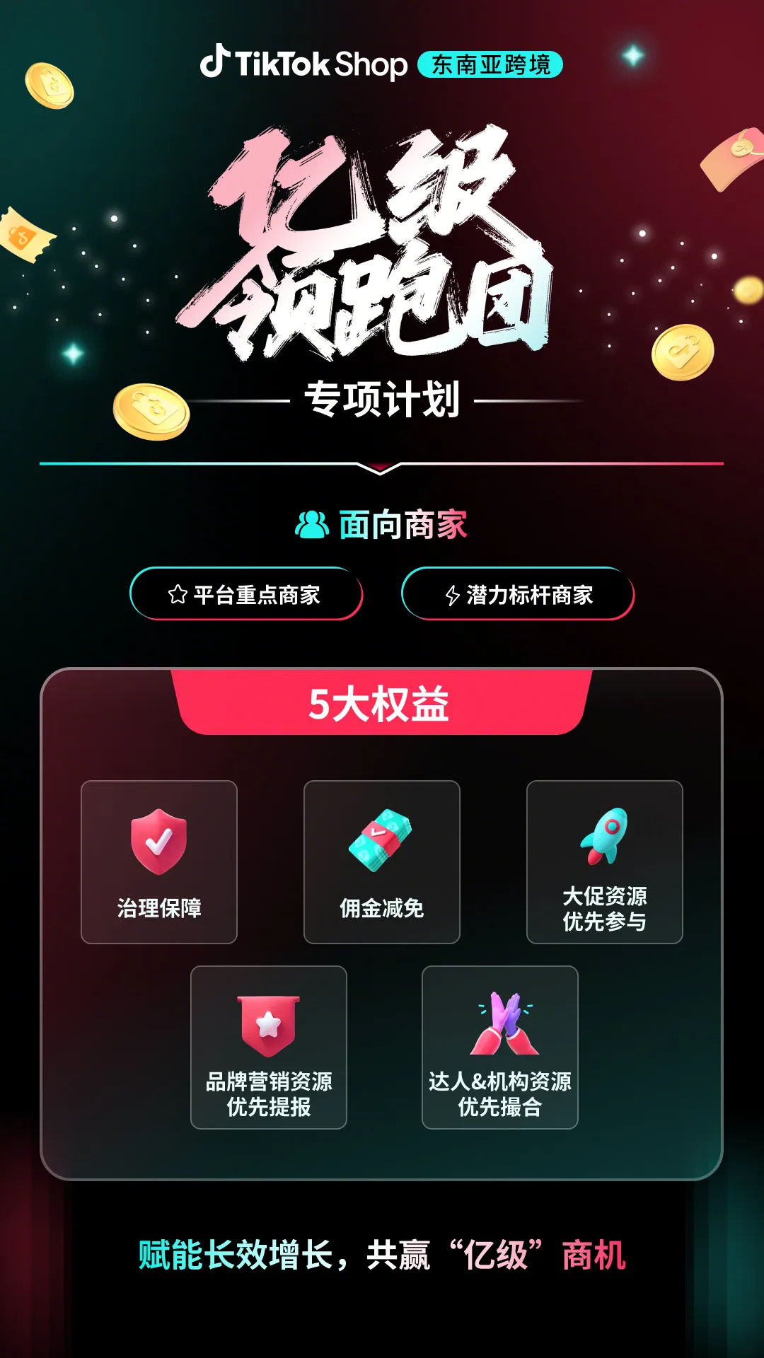 入选「亿级领跑团」的商家,可享受平台全方位、优先级的五大赋能支持,助力生意突破: