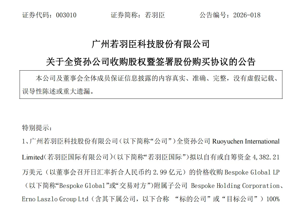 近期,“电商代运营第一股” 若羽臣发布公告,以 4382.21 万美元(约合 2.99 亿元人民币)收购美国百年高端护肤品牌奥伦纳素 100% 股权,目前交易已完成全部交割。