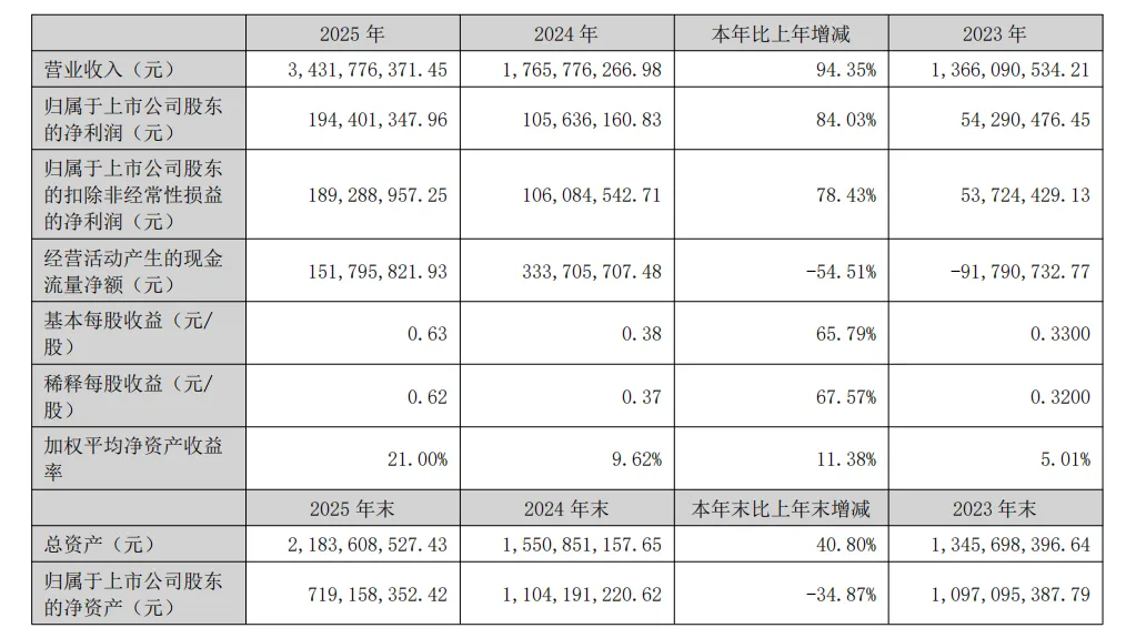 这份转型在 2025 年交出了亮眼的成绩单:公司实现营业收入 34.32 亿元,同比大幅增长 94.35%;归属于上市公司股东的净利润 1.94 亿元,同比增长 84.03%;