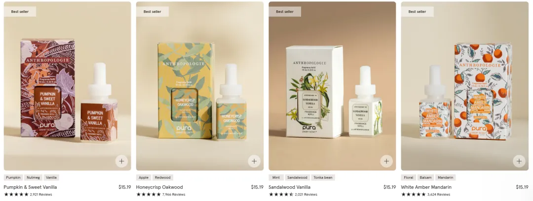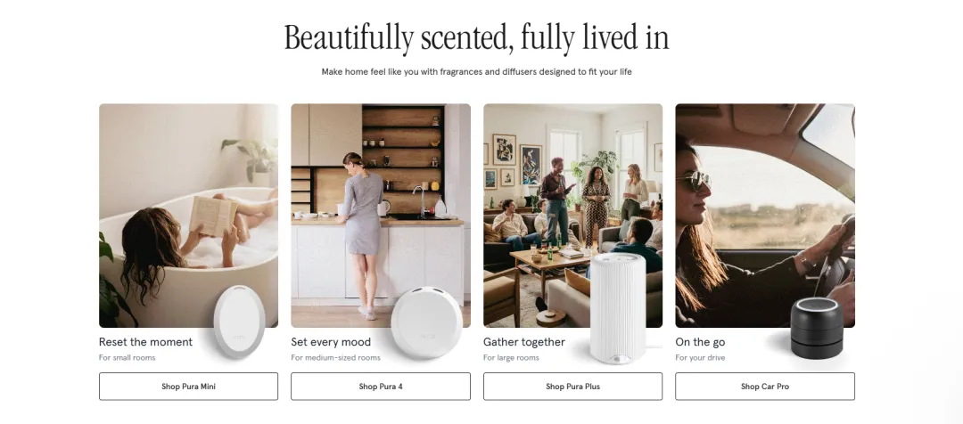 二是安全与场景适配:主打“纯净香氛”,避免有害化学成分,同时构建覆盖 34.99-79.99 美元价格带的产品矩阵,从 Pura Mini到 Pura Plus,再到车载系列,精准匹配不同场景需求。2025 年,Pura 还与潘通合作推出定制香氛及 Pura 4 扩香机,让用户“闻到潘通年度色彩”,进一步强化设计美学与场景仪式感。
