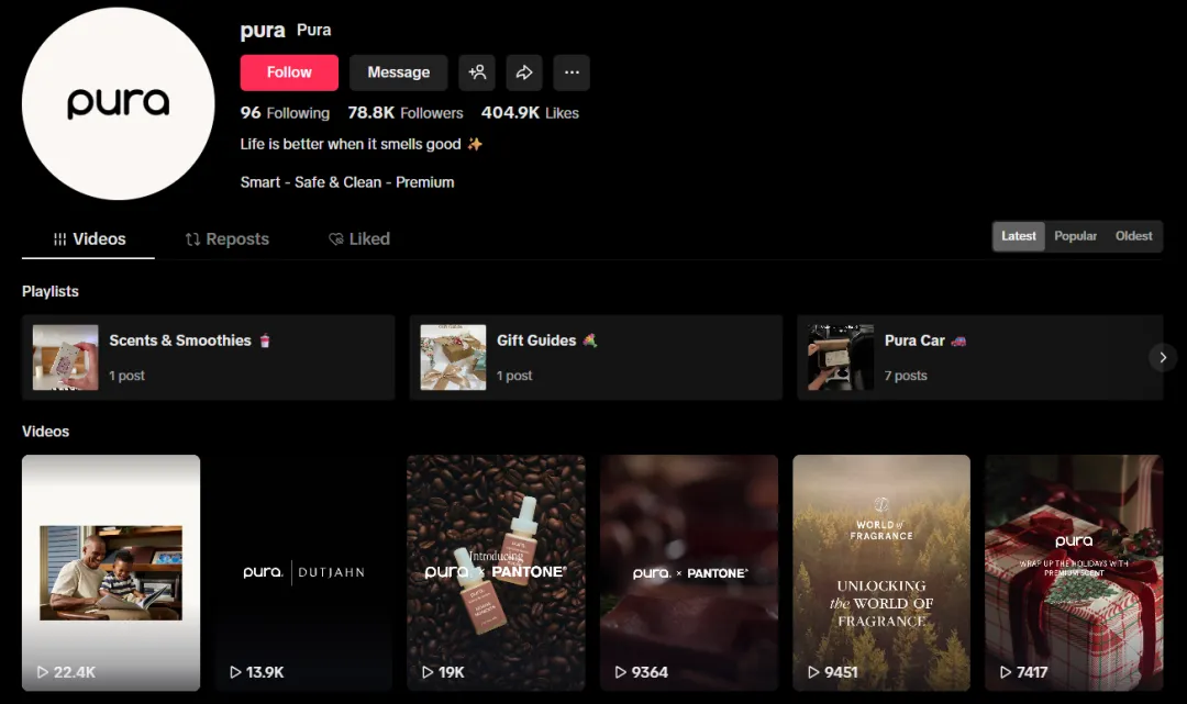 香氛的核心营销难点是“无形性”,Pura 通过“TikTok场景种草+YouTube 深度测评”的红人组合策略,将无形香气转化为可感知的生活体验。