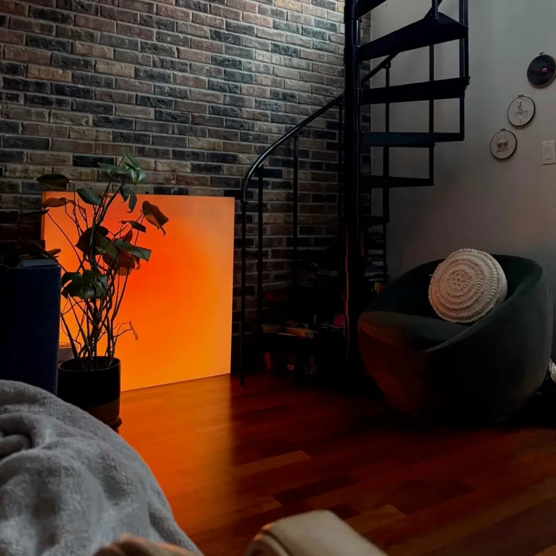 虽然都叫落日,但它俩各方面都非常不一样。新落日灯名为The Sol Study,被定义为发光艺术面板(Illuminated Art Panel),而非传统灯具或装饰画。从命名到定位都模糊了灯具和装饰画的界限,甚至营销称之为心理健康设备。